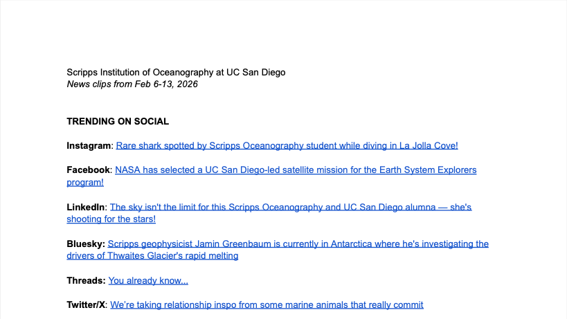 I support Scripps’ communications team through weekly and monthly media monitoring, tracking earned press coverage across local, national, and international outlets. These reports help evaluate research visibility, identify trending narratives, and inform future storytelling strategy.